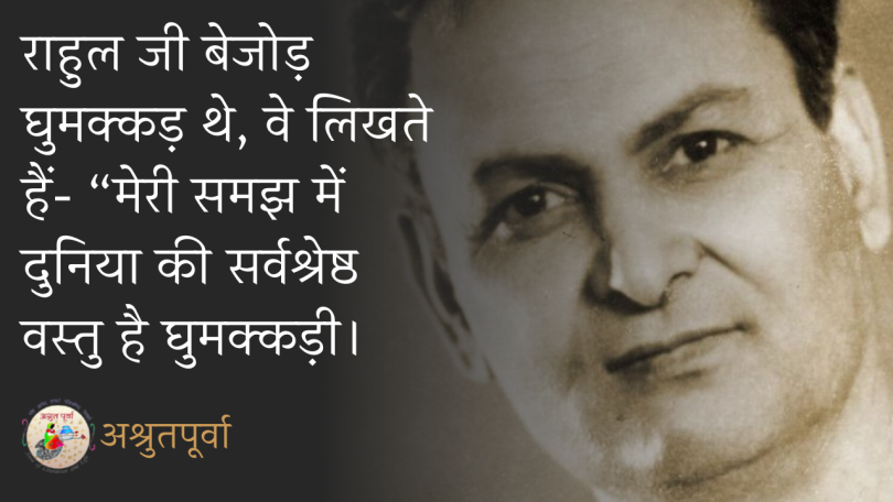 राहुल जी बेजोड़ घुमक्कड़ थे, वे लिखते हैं- “मेरी समझ में दुनिया की सर्वश्रेष्ठ वस्तु है घुमक्कड़ी। घुमक्कड़ से बढ़कर व्यक्ति और समाज का कोई हितकारी नहीं हो सकता। दुनिया दुख में हो चाहे सुख में, सभी समय यदि सहारा पाती है तो घुमक्कड़ों की ही ओर से। प्राकृतिक आदिम मनुष्य परम घुमक्कड़ था। आधुनिक काल में घुमक्कड़ों के काम की बात कहने की आवश्यकता है, क्योंकि लोगों ने घुमक्कड़ों की कृतियों को चुरा के उन्हें गला फाड़–फाड़कर अपने नाम से प्रकाशित किया। जिससे दुनिया जानने लगी कि वस्तुत: तेली के कोल्हू के बैल ही दुनिया में सब कुछ करते हैं। आधुनिक विज्ञान में चार्ल्स डार्विन का स्थान बहुत ऊँचा है। उसने प्राणियों की उत्पत्ति और मानव–वंश के विकास पर ही अद्वितीय खोज नहीं की, बल्कि कहना चाहिए कि सभी विज्ञानों को डार्विन के प्रकाश में दिशा बदलनी पड़ी। लेकिन, क्या डार्विन अपने महान आविष्कारों को कर सकता था, यदि उसने घुमक्कड़ी का व्रत न लिया होता। आदमी की घुमक्कड़ी ने बहुत बार खून की नदियाँ बहायी है, इसमें संदेह नहीं और घुमक्कड़ों से हम हरगिज नहीं चाहेंगे कि वे खून के रास्ते को पकड़ें। किन्तु घुमक्कड़ों के क़ाफ़िले न आते जाते, तो सुस्त मानव जातियाँ सो जातीं और पशु से ऊपर नहीं उठ पातीं। अमेरिका अधिकतर निर्जन सा पड़ा था। एशिया के कूपमंडूक को घुमक्कड़ धर्म की महिमा भूल गयी, इसलिए उन्होंने अमेरिका पर अपनी झंडी नहीं गाड़ी। दो शताब्दियों पहले तक आस्ट्रेलिया खाली पड़ा था। चीन, भारत को सभ्यता का बड़ा गर्व है, लेकिन इनको इतनी अक्ल नहीं आयी कि जाकर वहाँ अपना झंडा गाड़ आते।“