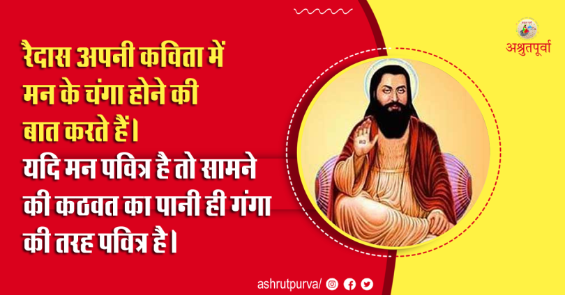रैदास अपनी कविता में मन के चंगा होने की बात करते हैं। यदि मन पवित्र है तो सामने की कठवत का पानी ही गंगा की तरह पवित्र है। मन की शुद्धता, वाणी की शुद्धता और कर्म की शुद्धता रैदास की वाणी का मर्म है। रैदास ने अपनी मानसिक और वैचारिक दृढ़ता से श्रम को प्रतिष्ठा दी । उनके लिए कर्ममय जीवन ही पूजा है। ‘जहँ-जहँ डोलउ सो परिक्ररमा जो कुछ करौं सो पूजा’। सहज जीवन क्रम में हम जहाँ कहीं भी जाते हैं वही परिक्रमा है, जो कुछ करते हैं वह पूजा की तरह पवित्र है।
