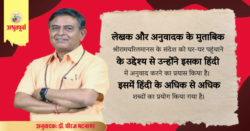 उन्होंने कहा, गोस्वामी तुलसीदास ने रामचरितमानस के रूप में रामकथा को जन-जन तक पहुंचाने के लिए मध्यकाल में उत्तर भारत की जनमानस की भाषा अवधी को चुना, लेकिन आज जनमानस की भाषा खड़ी बोली हिंदी है। भटनागर ने बताया कि श्रीरामचरितमानस के संदेशको घर-घर पहुंचाने के उद्देश्य से उन्होंने इसका हिंदी में अनुवाद करने का प्रयास किया है। इसमें आम भाषा का उपयोग करने का प्रयास किया है और हिंदी के अधिक से अधिक शब्दों का उपयोग किया है।