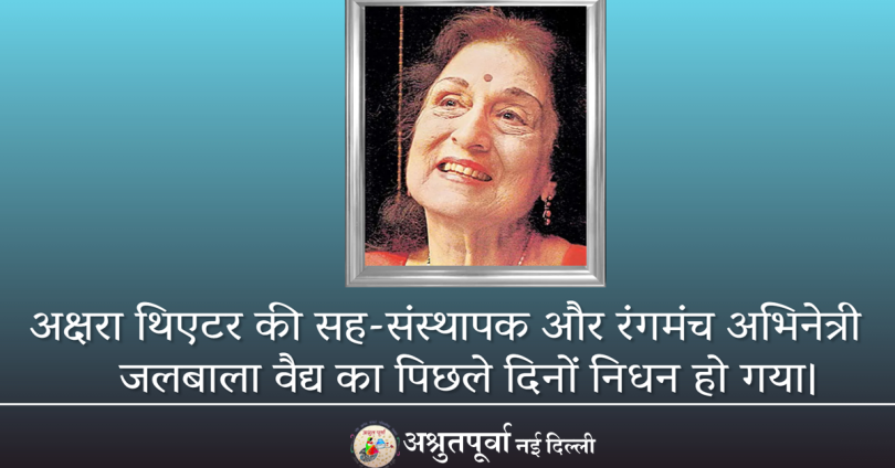 नई दिल्ली। दिग्गज रंगमंच अभिनेत्री और अक्षरा थिएटर की सह-संस्थापक जलबाला वैद्य का पिछले दिनों निधन हो गया। वे 86 वर्ष की थीं। वे सांस संबंधी बीमारियों से ग्रस्त थीं। उनकी बेटी और रंगमंच की निर्देशक अनासुया वैद्य शेट्टी ने यह जानकारी दी। लंदन में लेखक सुरेश वैद्य और अंग्रेजी शास्त्रीय गायिका मैज फ्रेंकिस के घर जन्मीं जलबाला वैद्य ने एक पत्रकार के रूप में करियर शुरू किया था।