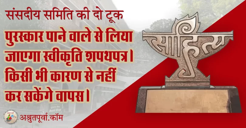 समिति का मानना है कि साहित्य अकादेमी या दूसरी अकादमियां अराजनीतिक संगठन हैं। इनमें राजनीति के लिए कोई जगह नहीं। इसलिए पुरस्कार पाने वाले से स्वीकृति के लिए एक शपथपत्र लिया जाए। समिति ने अपनी रपट में यहां तक कहा है कि शपथपत्र के बिना पुरस्कार दिए ही नहीं जाने चाहिए। यह भी तय होना चाहिए कि अगर कोई पुरस्कार लौटाए तो भविष्य में कभी उसके नाम पर दोबार विचार न हो।