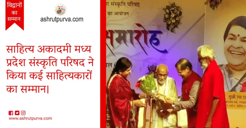 नई दिल्ली। पिछले दिनों भोपाल में साहित्य अकादमी मध्य प्रदेश संस्कृति परिषद ने साहित्यकारों को सम्मानित किया। एक भव्य समारोह में कृति पुरस्कार के तहत 13 अखिल भारतीय पुरस्कार और 15 प्रादेशिक पुरस्कार दिए गए। इसके साथ ही अकादमी की ओर से मध्य प्रदेश की छवि निमाड़ी के कृति पुरस्कार दिए गए। साल 2018, 2019, 2020 और 2021 के कृति पुरस्कार और मध्य प्रदेश की छह बोलियों के कृति पुरस्कार (2020 और 2021) से पुररस्कृत विद्वानों को सम्मानित किया गया। समारोह में विभिन्न क्षेत्रों के विद्वानों को सम्मानित किया गया। इस तरह पिछले चार बरसों के पुरस्कार वितरित किए गए।