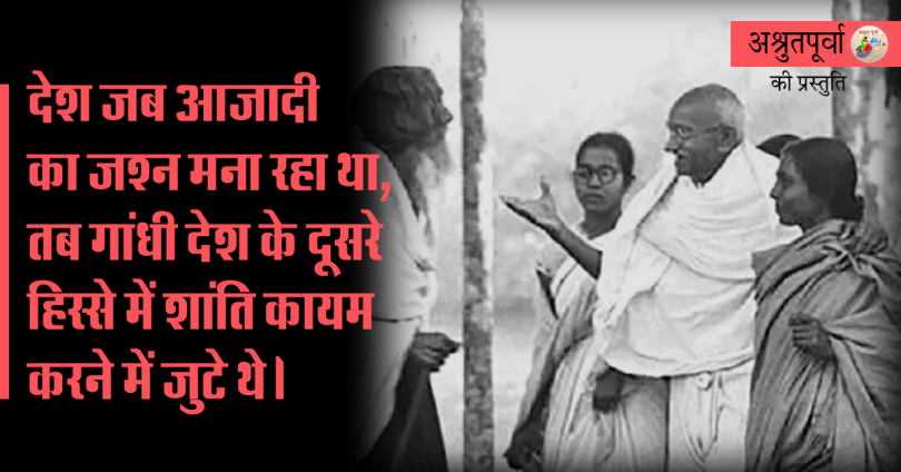 यह तथ्य है कि महात्मा गांधी ने न तो दिल्ली में आयोजित स्वतंत्रता दिवस समारोह में और न ही देश के दूसरे हिस्से में मनाए जा रहे जश्न में हिस्सा लिया। क्या वजह थी इसकी। उस दौर का इतिहास खंगालें तो पता चलता है कि बापू उस दिन कलकत्ते में थे। दिन भर दो समुदायों को समझाने बुझाने और उन्हें शांत करने में लगे रहे। वे पंद्रह अगस्त से पहले ही यहां पहुंच गए थे। और एक दूसरे से लड़ने-मरने पर आतुर दो समुदायों में शांति कायम करने में जुट गए थे।