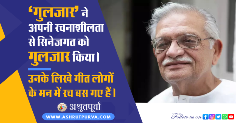 क्या ही बेहतरीन शख्सियत हैं गुलजार। वे अपनी रचनाओं में इतनी गहरी भावना और इतनी मिठास डाल देते हैं कि वह बरसों-बरस जेहन में रहती है। किसने सोचा था अरोड़ा सिख परिवार का यह लड़का संपूर्ण सिंह गुलजार के नाम से एक दिन शोहरत की बुलंदियों को छू लेगा। गुलजार को स्कूल के दिनों में ही संगीत और शायरी का चस्का था। वे अकसर संगीत कार्यक्रमों में जाया करते थे। उनको धीरे धीरे संगीत की समृद्ध विरासत हासिल हुई। इसी विरासत ने उनकी परख को नया विस्तार दिया।