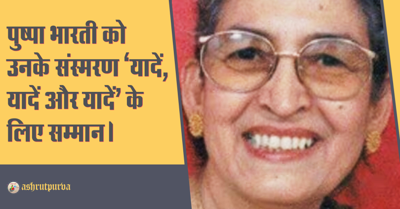 पुष्पा भारती का संस्मरण 2016 में छपा था। बता दें कि व्यास सम्मान चयन वर्ष से दस साल पहले तक की अवधि में छपी हिंदी की किसी उत्कृष्ट कृति को प्रदान किया जाता है। रचनाकार भारतीय होना चाहिए। बिड़ला फाउंडेशन ने 1991 में इस सम्मान की शुरुआत की थी।
