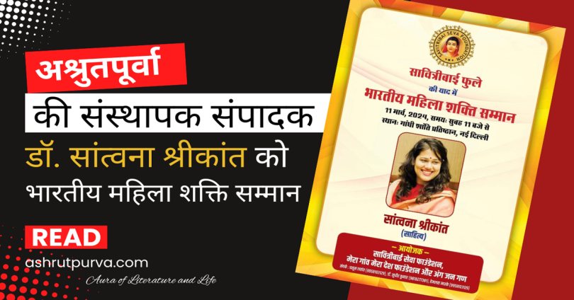 नई दिल्ली। सावित्री बाई सेवा फाउंडेशन पुणे, अंग जन गण और मेरा गांव मेरा देश फाउंडेशन अंतरराष्ट्रीय महिला दिवस के परिप्रेक्ष्य में और सावित्रीबाई फुले की पुण्यतिथि पर अपने क्षेत्र में बड़ा कार्य कर रही 24 महिलाओं को भारतीय महिला शक्ति सम्मान से सम्मानित करेगा। इनमें अश्रुतपूर्वा की संस्थापक संपादक डॉ. सांत्वना श्रीकांत भी शामिल हैं। नई दिल्ली स्थित गांधी शांति प्रतिष्ठान के सभागार में 11 मार्च को आयोजित सम्मान समारोह में सभी को सम्मानित किया जाएगा।
