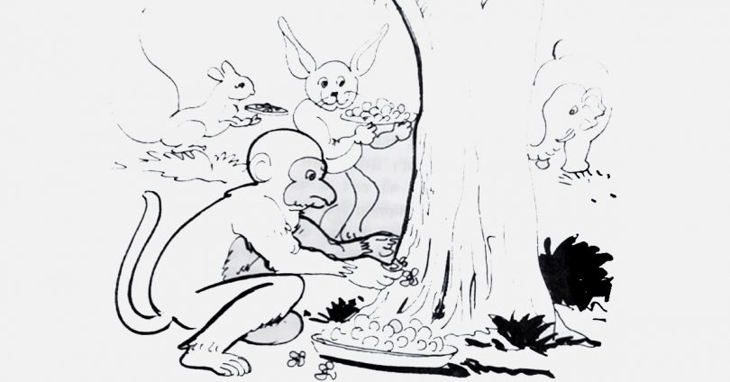 जानवर लंबे-लंबे डग भरते भागे जा रहे थे। किसी के हाथ में थाली थी, किसी के हाथ में लोटा और कोई धूप-अगरबत्ती लिए था। बीजू बंदर एक पेड़ पर बैठा नाशपाती खा रहा था। वह यह नजारा देख कर चौंक उठा।