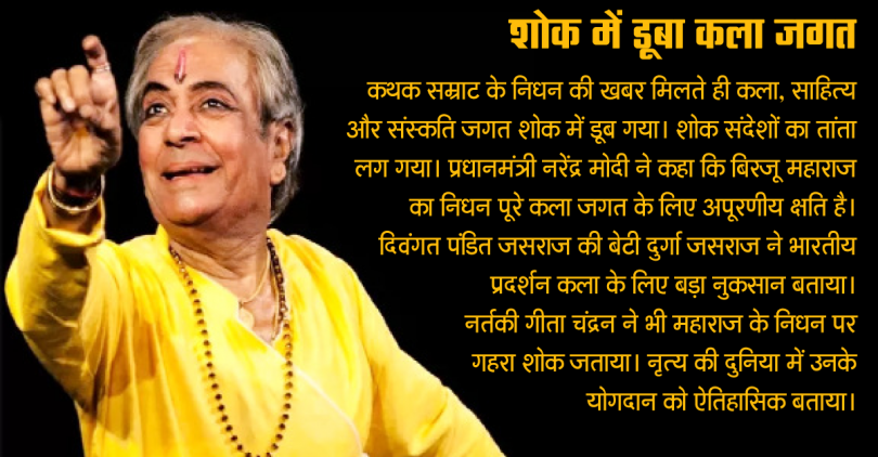 कथक सम्राट के निधन की खबर मिलते ही कला, साहित्य और संस्कति जगत शोक में डूब गया। शोक संदेशों का तांता लग गया। प्रधानमंत्री नरेंद्र मोदी ने कहा कि बिरजू महाराज का निधन पूरे कला जगत के लिए अपूरणीय क्षति है।