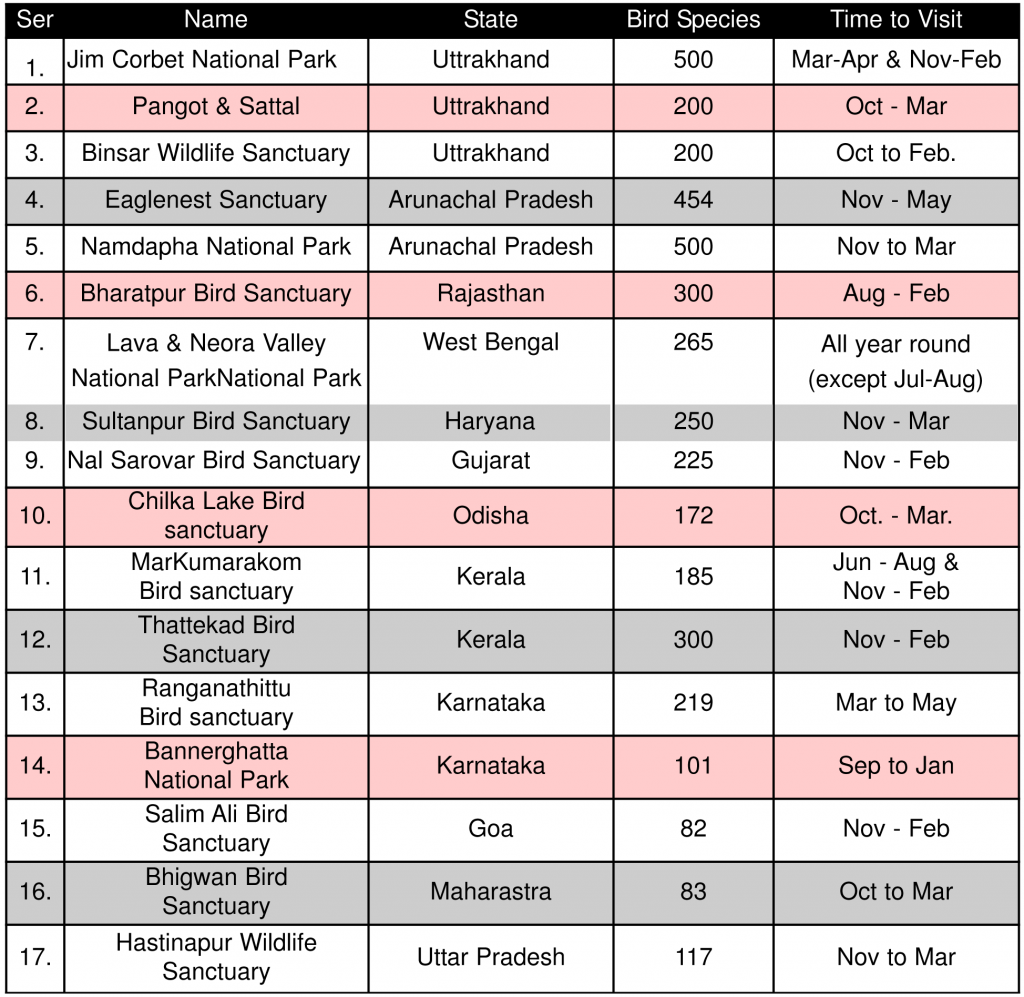 (a) The number of bird species found is an approximate figure based on several websites. (b) Prior to visiting any of the Sanctuaries/ National parks, it is advisable to study them thoroughly on the net to get the maximum benefit out of your trip.