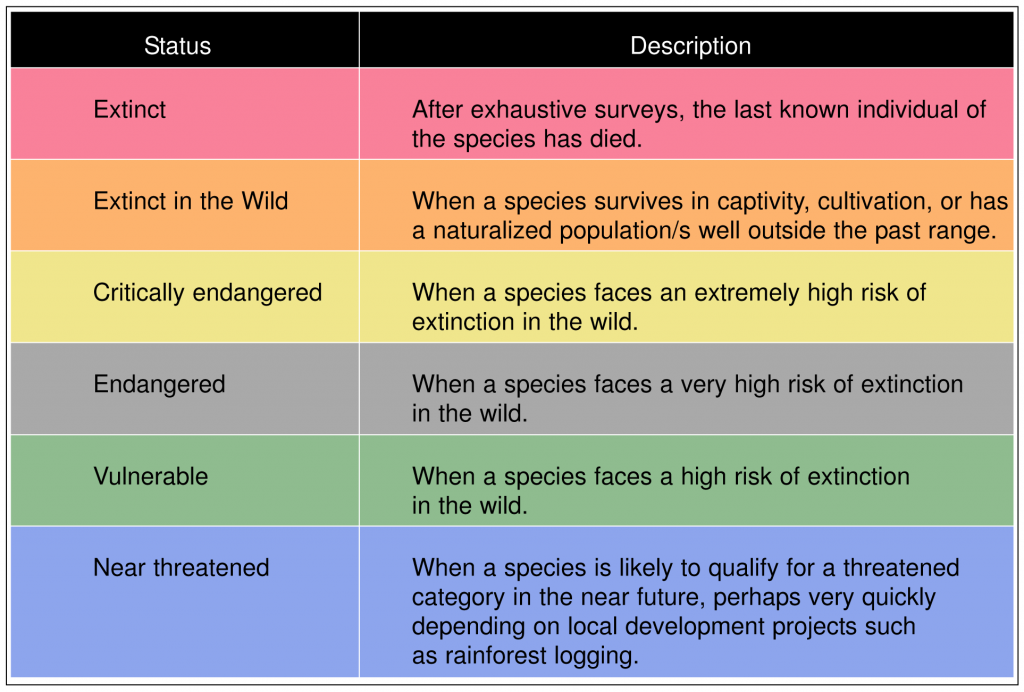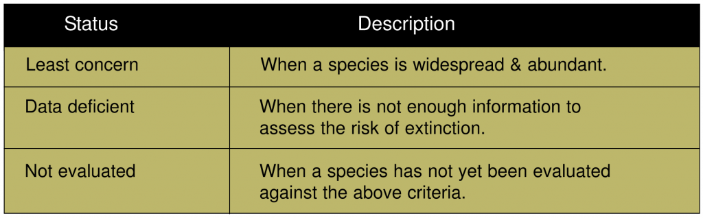 Conservation Status of animals & plants is decided by the International Union for Conservation of Nature’ or IUCN based on scientific information collected by specialists groups & organizations. One of such societies in India is the Bombay Natural History Society (BNHS). IUCN is a global conservation group that carries out research threatened species & coordinates conservation strategies & plans. The categorization of wildlife based on the conservation status is as follows