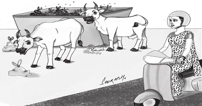 पता नही क्यों कचड़े में गायों को चरते देख मुझे सूरदास जी के पद में वर्णित ‘गायों के ‘गोल्डेन ऐरा’ (golden era) भी याद आ जाता है।जब कृष्ण भगवान ग्वाल बालों संग गायों के झुंड वनों में चराने ले जाते थे। गायें मस्त होकर ‘हेल्दी फूड’ खाती थीं और तो और साथ में कृष्ण जी की मुरली की तान के संग हल्की धूप में,अधखुली पलकें लिए जुगाली का असीम आनंद भी मिलता था। आज परिस्थितियां पलट चुकी हैं। विकास का दौर है ग्वालबाल अब वैसे नही रहे। ‘लाइफ बिकम सो बिजी’ ,,, वैसे भी गोकुल जैसे वन अब कहाँ? हाँ कान्हा की बंसी का ‘सब्सटीट्यूट’ मोबाइल के रूप में अवश्य आ गया है लेकिन उस पर बजने वाली संगीत लहरी हर समय गायों के लिए नही होती,अक्सर वे ग्वालों के कानों में इयरप्लग की नलियों द्वारा, उन तक ही सीमित होती हैं।