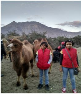 कहते हैं खेती के मौसम में नुब्रा घाटी में कुछ खेती होती है। उस समय यह घाटी निश्चित ही सुन्दर लगती होगी। यह सियाचीन ग्लेशियर से निकली नुब्रा नदी की घाटी है जहाँ श्योक नदी भी बहती है । यहां हुंडर का रेगिस्तान एक अद्भुत नजारा है । यह नुब्रा सामाज्य की राजधानी हुआ करता था। डिस्किट मोनेस्ट्री से लगभग 8 कि.मी की दूरी पर सफेद बालू का रेगिस्तान है। बर्फ के रेगिस्तान में बालू का रेगिस्तान,एक और अजूबा । पहली नजर में देखने पर यह कृत्रिम लगता है । जैसे शहरों में मेले में दो चार ऊँटों के साथ कुछ बालू के टिले भी बना दिए जाते हैं ठीक वैसा ही। चारों तरफ ऊँचे पहाड़ों से घिरे इलाके में कुछ दूर तक चाँद के आकार के सफेद बालू के ढेर नजर आते हैं। पहाड़ का पानी पारदर्शी होता है लेकिन लद्दाख में नदियों के पानी का रंग धूसर है । ऐसा लगता है मानो पानी में सिमेंट घुला हो और बालू सिमेंट के टीलों जैसा लगता है । यहीं पर दो कुबड़ वाले ऊँटों का डेरा हैं। यहां एक मजेदार घटना घटी। मैंने ऊँट के एक छ: महीने के बच्चे की फोटो अपने बच्चों के साथ लेनी चाही। वो बार-बार अपना मुँह फेर लेता । परेशान होकर मैंने कहा “छोड़ो, शायद इसे फोटो खिंचवाना पसंद नहीं है ।” बच्चे ऊँट की सवारी करने निकल गए । धीरे-धीरे अँधेरा होने लगा और चांद नजर आने लगा । तभी अचानक लगा मेरे कान के पास कुछ है । मैंने पीछे देखा तो वही बच्चा मेरा ध्यान अपनी तरफ आकर्षित करने की कोशिश कर रहा था । उसकी भाषा मैं नहीं समझ सकती थी लेकिन मेरे अन्तर्मन को लगा जैसे वो कह रहा है-‘अब मेरी फोटो लो ।’ यकीन मानिए, इसके बाद उसने एक फिल्म स्टार की तरह खड़े होकर मेरे बच्चों के साथ अपनी फोटो खिंचवाई । उसके बालसुलभ नखरे पर हमसब बहुत देर तक हंसते रहे ।