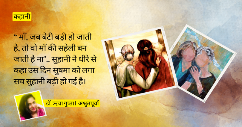“ माँ, जब बेटी बड़ी हो जाती है, तो वो माँ की सहेली बन जाती है ना” .. सुहानी ने धीरे से कहा उस दिन सुषमा को लगा सच सुहानी बड़ी हो गई है। फिर सुहानी चुहल कर बोली “पता है माँ युवान कह रहा था तुम कब अपनी माँ सी दिखोगी। सोच रहा हूँ तुम्हारे साथ तुम्हारी माँ को भी अपने साथ ले जाऊँ।” सुषमा शर्म से लाल हो गई उसने सुहानी के सर पर प्यार से हाथ मारा