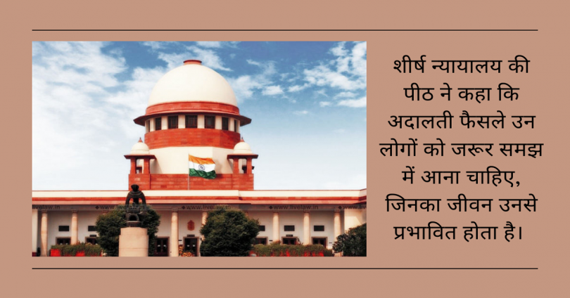 इसी संदर्भ में शीर्ष न्यायालय ने कहा, हिमाचल प्रदेश उच्च प्रदेश न्यायालय की खंडपीठ का निर्णय समझ से बाहर है। इस अदालत को अपील की सुनवाई करते हुए उच्च न्यायालय के निर्णय में ‘समझ से परे’ भाषा को समझने के लिए खुद जूझना पड़ा है। एक वादी के लिए तो फैसले की भाषा और कठिन हो जाएगी। कानून की दृष्टि से अप्रशिक्षित वादी का सामना ऐसी भाषा से होता है जिसे समकालीन अभिव्यक्ति में सुना, लिखा बोला या बोला नहीं जाता है।