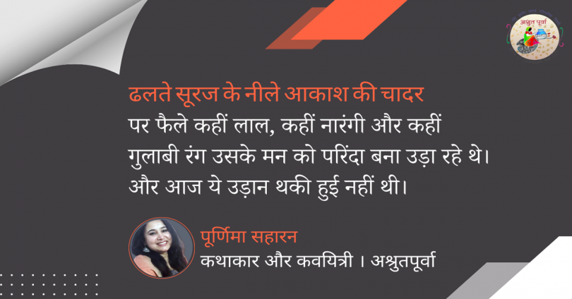 ढलते सूरज के नीले आकाश की चादर पर फैले कहीं लाल, कहीं नारंगी और कहीं गुलाबी रंग उसके मन को परिंदा बना उड़ा रहे थे। और आज ये उड़ान थकी हुई नहीं थी। उसके पंख, नए उत्साह और जोश से भर कर फड़फड़ा रहे थे।