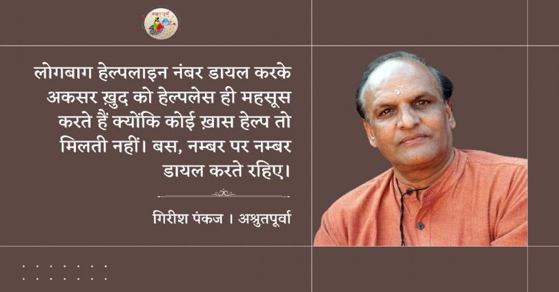 इतना बोलने के बाद कॉल डिस्कनेक्ट हो गया। भूखा परेशान। उसने एक बार फिर हेल्पलाइन नंबर को रिंग किया। काफ़ी देर बाद फिर वही रिकॉर्डेड आवाज़ आई, “हेल्पलाइन नंबर 420 में आपका स्वागत है। अँग्रेज़ी में बात करने के लिए एक नंबर दबाइए। हिन्दी में बात करने के लिए दो नंबर और केवल मनोरंजन करना हो तीन दबाएँ। भक्ति संगीत सुनना है तो चार दबाएँ। मौसम का हाल जानना हो तो पाँच दबाएँ।”