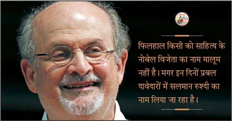 नई दिल्ली। नोबेल पुरस्कारों की घोषणा शुरू हो गई है। सबकी निगाहें इस बात पर भी है कि इस बार साहित्य का नोबेल किसको मिलेगा। अभी यह कयास भर है। मगर चर्चा तो शुरू हो ही गई है। फिलहाल किसी को साहित्य के नोबेल विजेता का नाम मालूम नहीं है। मगर इन दिनों प्रबल दावेदारों में सलमान रुश्दी का नाम लिया जा रहा है। आपको याद होगा कि अभी हाल में एक कार्यक्रम के दौरान सलमान को एक हमलावर ने गंभीर रूप से जख्मी कर दिया था।