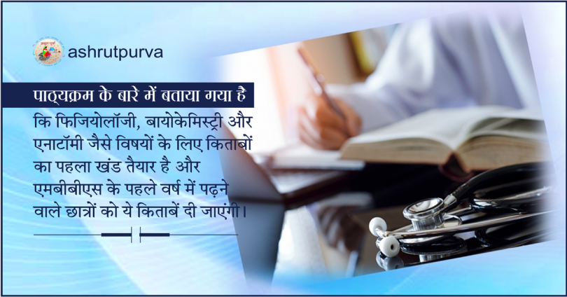 पाठ्यक्रम के बारे में बताया गया है कि फिजियोलॉजी, बायोकेमिस्ट्री और एनाटॉमी जैसे विषयों के लिए किताबों का पहला खंड तैयार है और एमबीबीएस के पहले वर्ष में पढ़ने वाले छात्रों को ये किताबें दी जाएंगी। तीन विषयों की पाठ्य पुस्तकें विशेषज्ञों के एक दल ने तैयार की है। इन पुस्तकों का दूसरा खंड तैयार किया जा रहा है। किताबें इस तरह तैयार की गई हैं तकनीकी शब्द रक्तचाप, रीढ़, हृदय, किडनी, लीवर या शरीर के अन्य महत्वपूर्ण अंगों और संबंधित शब्द हिंदी में लिखे गए हैं।