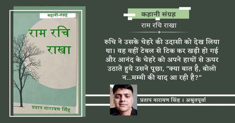 रुचि ने उसके चेहरे की उदासी को देख लिया था। वह वहीं टेबल से टिक कर खड़ी हो गई और आनंद के चेहरे को अपने हाथों से ऊपर उठाते हुये उसने पूछा, “क्या बात है, बोलो न…मम्मी की याद आ रही है?” आनंद को माखआ गया* और उसकी आँखें भरभरा गयीं।