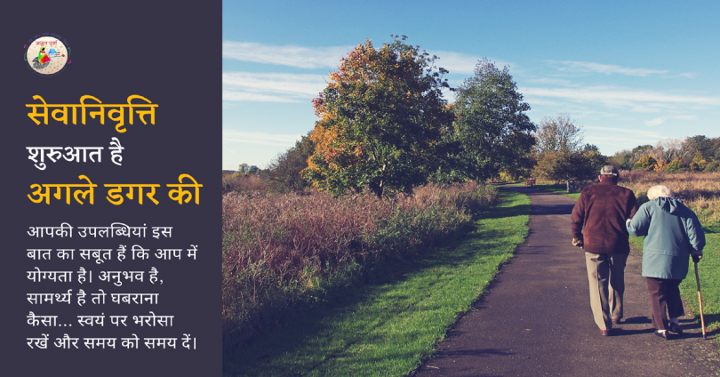 क्या करना है, कब करना है यह अभी निश्चित नहीं है, तो कोई बात नहीं। जो भी हुआ अच्छा था। जो होगा वह बेहतर ही होगा। आपकी उपलब्धियां इस बात का सबूत हैं कि आपमें योग्यता है। अनुभव है, सामर्थ्य है तो घबराना कैसा…स्वयं पर भरोसा रखें और समय को समय दें। अवसर आपकी प्रतीक्षा में है और आप अवसर की…दोनों एक दूसरे को जल्द ही मिलेंगे। क्योंकि सेवानिवृत्ति जीवन का अंत नहीं। यह अगले डगर की शुरुआत है।
