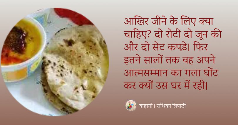 अभी अनुराग कुछ और बोलने के लिए मुंह खोलने ही वाला था कि पल्लवी झूले सी लटक गई उसके गले में। पल्लवी की इस हरकत के लिए अनुराग बिलकुल तैयार नहीं था। वह पीछे हटते हुए बोला, तुम न बच्ची ही रहोगी हमेशा। अब तो बड़ी हो जाओ। उसके बाहर जाते ही पल्लवी को भूख सताने लगी। वह सिल्वर फाइल से मुड़ी हुई रोटियां निकाल कर सब्जी के साथ खाने लगी। उसे लगा कि उस घर से कहीं ज्यादा ये रोटी स्वादिष्ट है। आखिर जीने के लिए क्या चाहिए? दो रोटी दो जून की और दो सेट कपड़े। फिर इतने सालों तक वह अपने आत्मसम्मान का गला घोंट कर क्यों उस घर में रही।