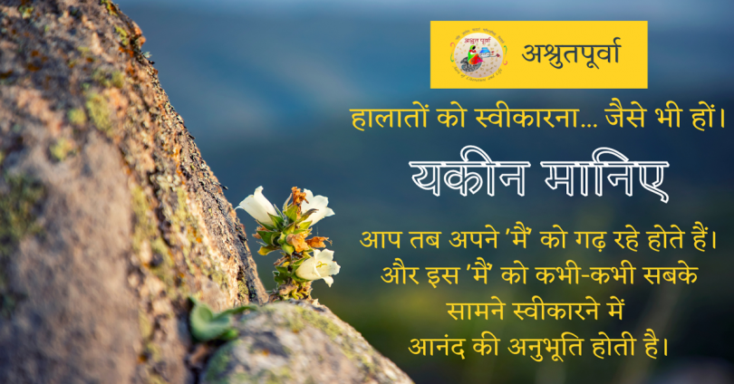 जीवन क्या है? क्या नही है? इस पर चर्चा तो चलती ही रहती है परन्तु इन चर्चाओं के निष्कर्ष से निकले बिन्दुओं को व्यवहार में कितना उड़ेल पाता है कोई वही असली जीवटता होती है। स्वीकारोक्ति सबसे बड़ी मांग है। हालातों को स्वीकारना…वो चाहे जैसे भी हों। जब आप स्वीकारते हुए आगे बढ़ रहे होते हैं,यकीन मानिए आप तब अपने ‘मैं’ को गढ़ रहे होते हैं। और इस ‘मैं’ को कभी-कभी सबके सामने स्वीकारने में आनंद की अनुभूति होती है।