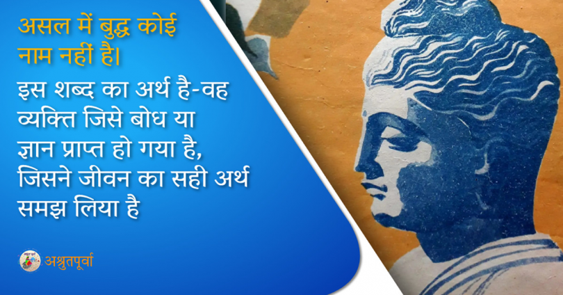 असल में बुद्ध कोई नाम नहीं है। इस शब्द का अर्थ है-वह व्यक्ति जिसे बोध या ज्ञान प्राप्त हो गया है, जिसने जीवन का सही अर्थ समझ लिया है, जिसने इस बात पर गहराई से सोचा-विचारा है कि शांति और सुख प्राप्त करने के लिए मनुष्य को किस तरह जीना चाहिए। बुद्ध का असली नाम या सिद्धार्थ वह एक राजकुमार थे और आज से ढाई हजार वर्ष से भी पहले इस देश में रहते थे