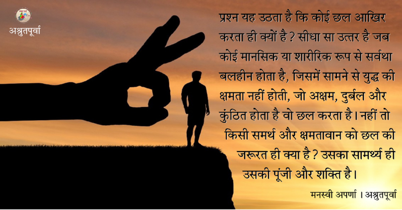 मानवीय संवेदनाओं को सबसे गहरी वेदना अगर कभी महसूस होती है, तो वह तब होती है जब परोक्ष या अपरोक्ष रूप से, छद्म या घोषित रुप से छली जाती हैं, छल यानी कथनी और करनी में अंतर, छल यानी अपने हितों को साधने के लिए झूठे प्रपंच रचना, छल यानी अपने फायदे के लिए दूसरे की भावनाओं से खिलवाड़, छल यानी एक ऐसा व्यूह जो विश्वास करने वाले के लिए अभेद्य हो। प्रश्न यह उठता है कि कोई छल आखिर करता ही क्यों है? सीधा सा उत्तर है जब कोई मानसिक या शारीरिक रूप से सर्वथा बलहीन होता है, जिसमें सामने से युद्ध की क्षमता नहीं होती, जो अक्षम, दुर्बल और कुंठित होता है वो छल करता है। नहीं तो किसी समर्थ और क्षमतावान को छल की जरूरत ही क्या है? उसका सामर्थ्य ही उसकी पूंजी और शक्ति होता है।