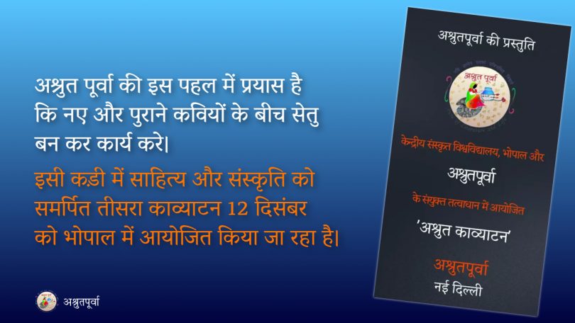 अश्रुतपूर्वा का तीसरा काव्याटन सोमवार, 12 दिसंबर को झीलों की नगरी भोपाल में आयोजित किया जा रहा है। इसमें प्रखर कवि मुदित श्रीवास्तव और पल्लवी त्रिवेदी अपनी कविताएं पढ़ेंगे वहीं भारत भवन के वरिष्ठ अधिकारी और चर्चित कवि प्रेम शंकर शुक्ल तथा राजीव सक्सेना भी इस काव्य पाठ का हिस्सा बनेंगे। इनके आलवा नीलेश रंघुवंशी, संगीता गुंदेचा और लिली मित्रा भी काव्य पाठ करेंगी।