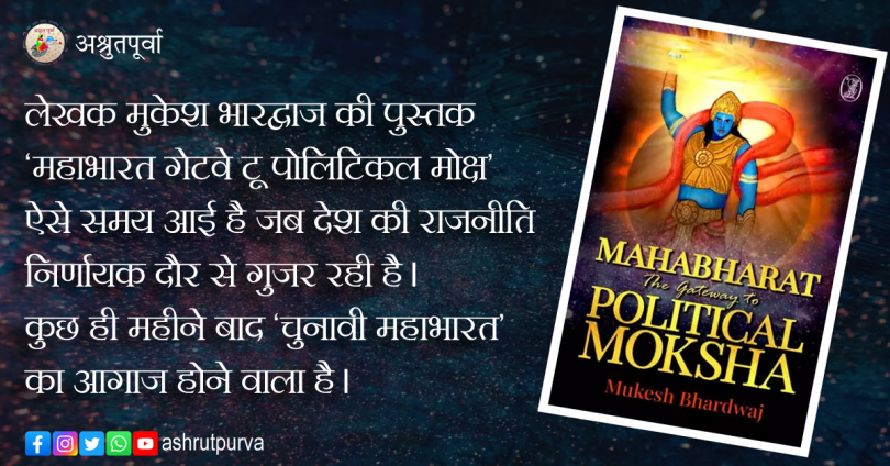 लेखक मुकेश भारद्वाज की पुस्तक ‘महाभारत गेटवे टू पोलिटिकल मोक्ष’ ऐसे समय आई है जब देश की राजनीति निर्णायक दौर से गुजर रही है। कुछ ही महीने बाद ‘चुनावी महाभारत’ का आगाज होने वाला है। इस पुस्तक में महाभारत के प्रमुख पात्रों का अलग-अलग अध्यायों में इस तरह वर्णन है कि वे समकालीन राजनीति का ही हिस्सा लगते हैं। यह पुस्तक पात्रों की नियति को सामने रखते हुए भारतीय राजनीति और समाज की मनोदशा को भी व्याख्यायित करती है। अभिमन्यु पर लिखा अध्याय बताता है कि युद्ध हो या राजनीति क्रूर योद्धा अपनी जीत के लिए सभी नियमों को ताक पर रख देते हैं। इस तरह की प्रवृत्ति आज की राजनीति का भी हिस्सा बन गई है। हम ऐसे चरित्र को देख सकते हैं।
