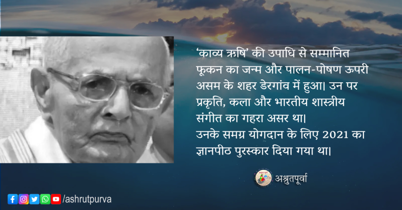 फूकन को 1990 में पद्मश्री और 2002 में साहित्य अकादेमी फेलोशिप प्रदान किया गया था। ‘काव्य ऋषि’ की उपाधि से सम्मानित फूकन का जन्म और पालन-पोषण ऊपरी असम के शहर डेरगांव में हुआ। उन पर प्रकृति, कला और भारतीय शास्त्रीय संगीत का गहरा असर था। (खबर मीडिया में आए समाचार की पुनर्प्रस्तुति)