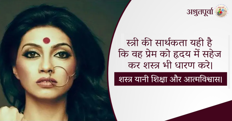 स्त्री की सार्थकता यही है कि वह प्रेम को हृदय में स्थान दे, मगर इसके साथ शस्त्र भी धारण करे। शस्त्र यानी शिक्षा और आत्मविश्वास। ये दोनों उसके ऐसे अदृश्य हथियार हैं जो जीवन के हर कठिन समय में काम आते हैं। समाज न तो स्त्री को समझ सकता है न ही उसके प्रेम को। इसलिए नारी सशक्तीकरण जरूरी है। दूसरी ओर स्त्री ने जब भी प्रेम किया वो मीरा बन गई और पूरे संसार में प्रेम का विस्तार किया। न मिलन की आस सजाई न ही प्रेम के बदले प्रेम मांगा। उसने बस प्रेम किया मूर्त और अमूर्त दोनों रूप में। प्रेम उसकी निजता है। उसकी गरिमा है।