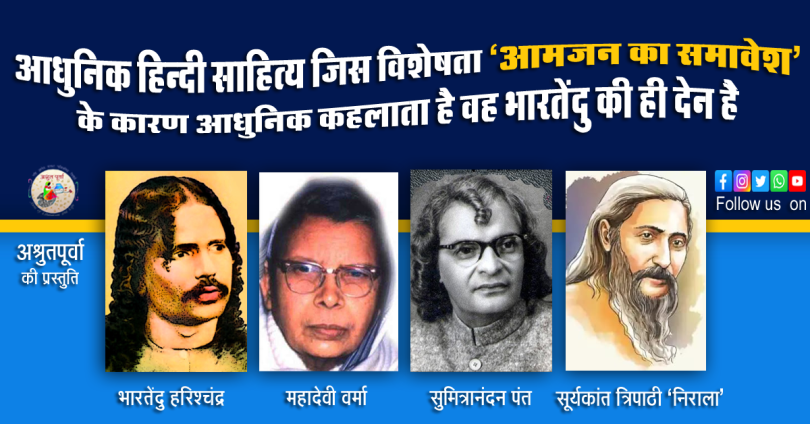 उन्नीसवीं सदी के दूसरे अर्धांश में साहित्य का परिदृश्य अचानक बदल जाता है और पहली बार साहित्य में आमजन के सुख –दुःख, पीड़ा, क्षोभ इत्यादि को स्थान मिलता है| इस काल के पहले खंड को ‘भारतेंदु युग’ के नाम से जाना जाता है और वास्तव में आधुनिक हिन्दी साहित्य जिस विशेषता – आमजन का समावेश – के कारण आधुनिक कहलाता है वह भारतेंदु की ही देन है|